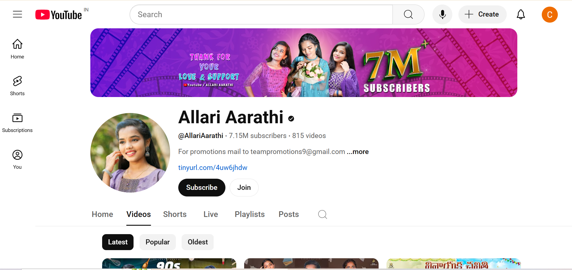 🎥 Allari Aarathi is a popular Indian YouTuber known for her engaging and humorous content. With over 7 million subscribers, she creates family-friendly vlogs that resonate with a wide audience. Her videos often feature relatable scenarios, comedic sketches, and heartwarming moments, making her channel ideal for brands looking to connect with a diverse and engaged viewer base.